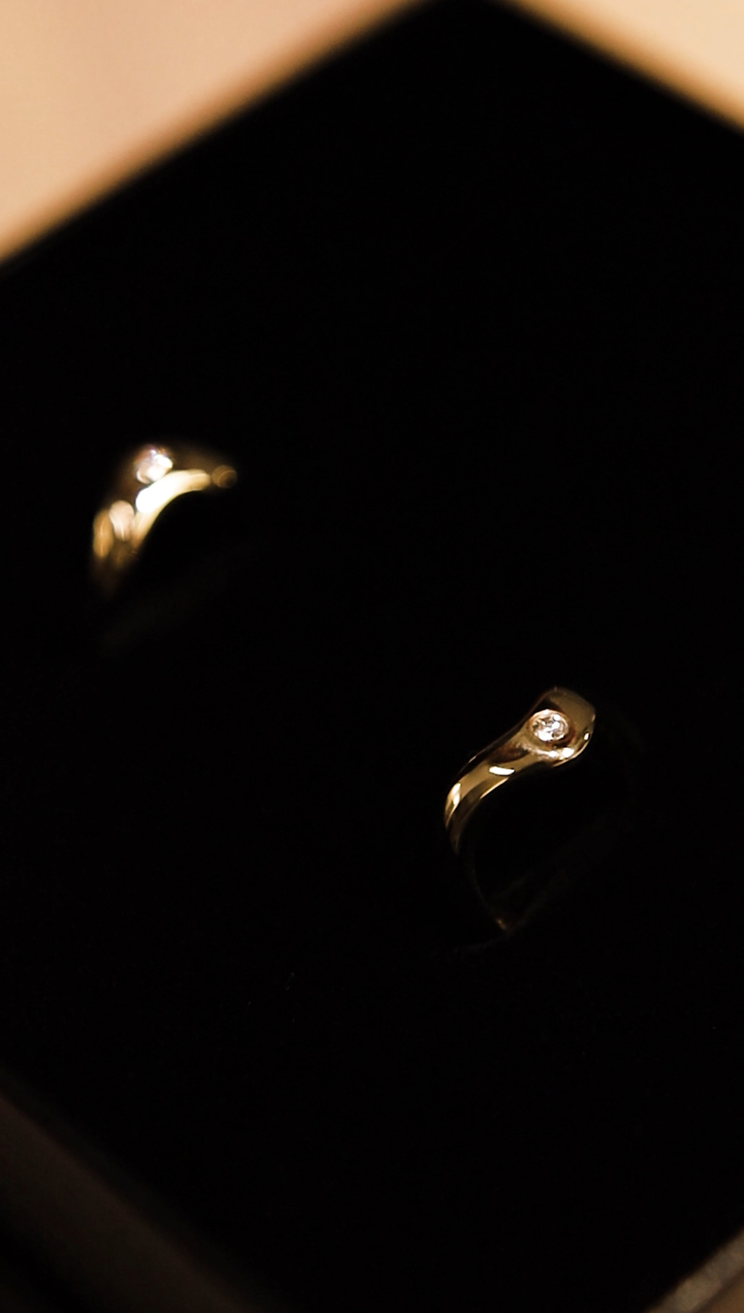Unikatowe kolczyki ze złota próby 585, wyrzeźbione ręcznie w jednym egzemplarzu, łączą subtelną elegancję z wyrafinowanym designem. Charakteryzują się płynnie wygiętą formą, której kształt przyciąga wzrok swoją harmonią i lekkością. W kolczykach osadzone są brylanty o łącznej masie 0,06 ct (kolor GH, czystość VS1), których blask doskonale komponuje się z ciepłym połyskiem złota, wprowadzając do całości nutę luksusu.