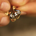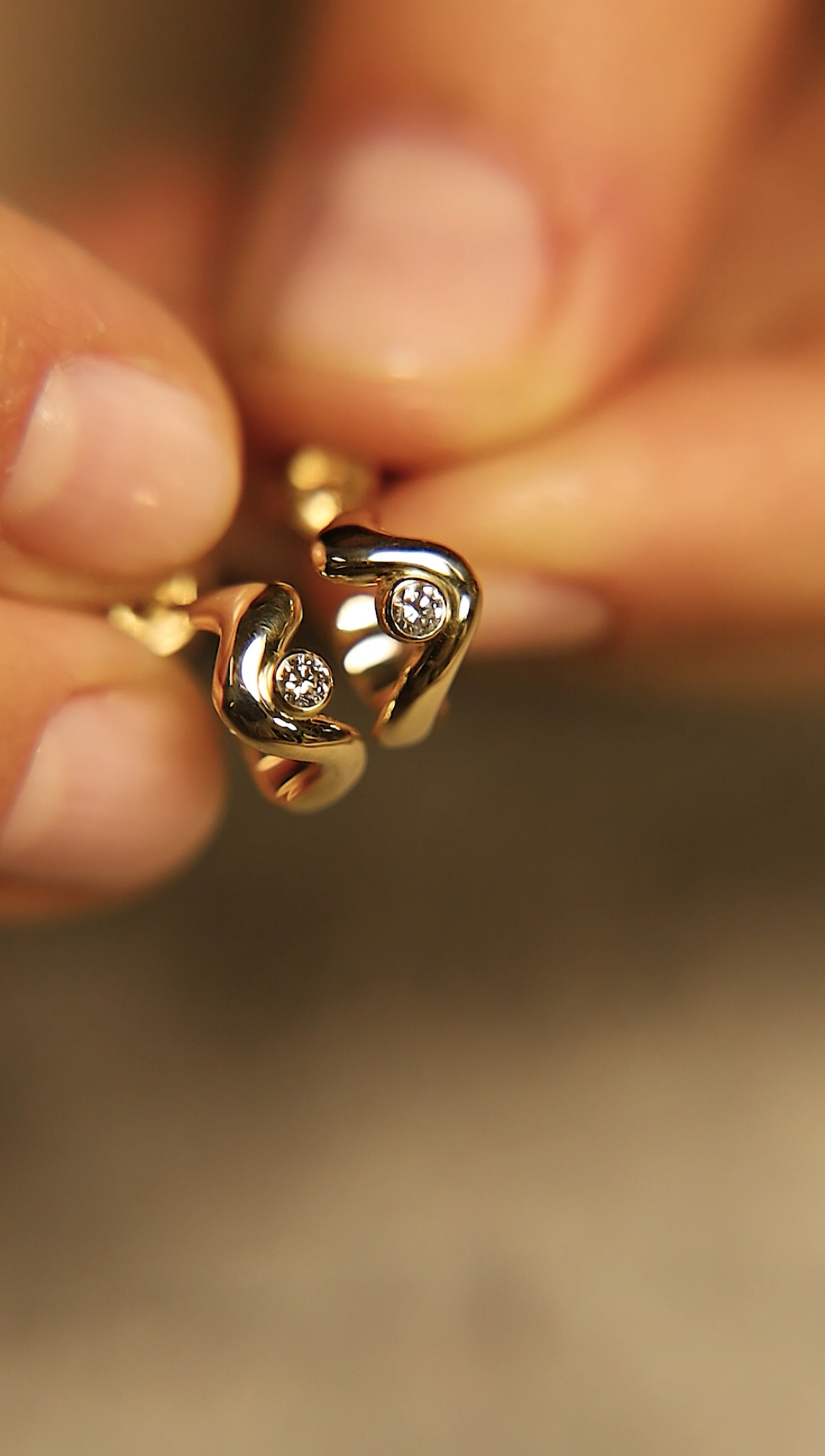 W sercu każdego kolczyka lśni brylant, a ich łączna masa to 0,12 ct (kolor GH, czystość VS1). Kamienie osadzone są tak, aby wydobywać blask z wnętrza złotej fali, tworząc iskrzący punkt światła pośród gładkiej, lustrującej powierzchni metalu. Ta subtelna gra światła i formy podkreśla wrażenie lekkości i harmonii, potęgując wrażenie obcowania z biżuterią doskonałą pod względem estetyki oraz rzemiosła.