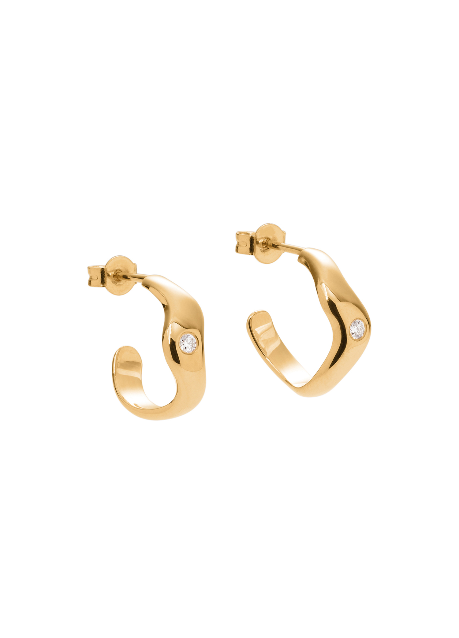 Unikatowe kolczyki ze złota próby 585, wyrzeźbione ręcznie w jednym egzemplarzu, łączą subtelną elegancję z wyrafinowanym designem. Charakteryzują się płynnie wygiętą formą, której kształt przyciąga wzrok swoją harmonią i lekkością. W kolczykach osadzone są brylanty o łącznej masie 0,06 ct (kolor GH, czystość VS1), których blask doskonale komponuje się z ciepłym połyskiem złota, wprowadzając do całości nutę luksusu.