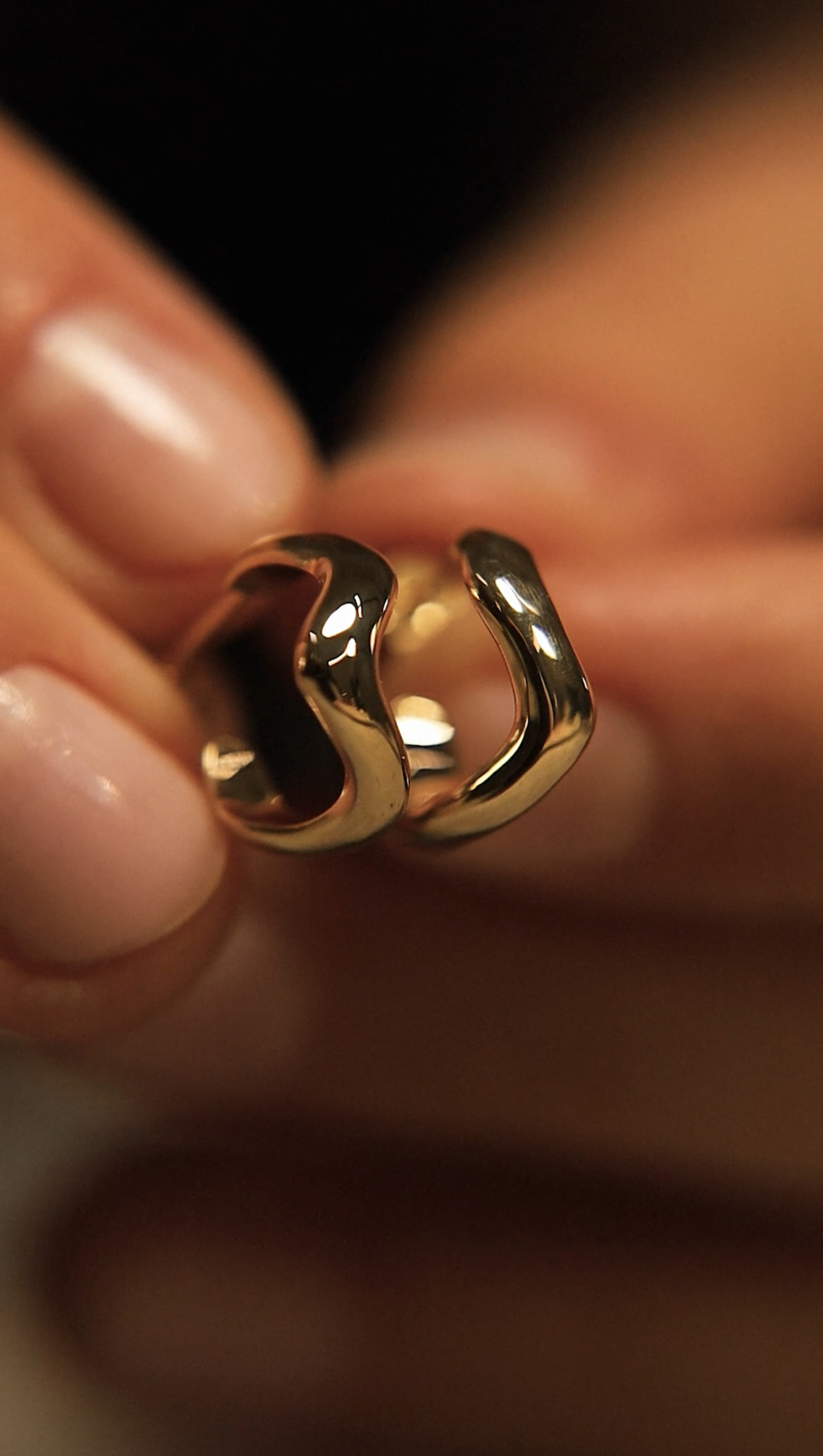Kolczyki o organicznej, zaokrąglonej formie przyciągają uwagę swoją płynnością i harmonią, a ich gładka powierzchnia doskonale odbija światło, podkreślając szlachetność złota. To wyjątkowy akcent, który doskonale uzupełni każdą stylizację, wprowadzając do niej subtelny, ale wyrafinowany i unikatowy detal.